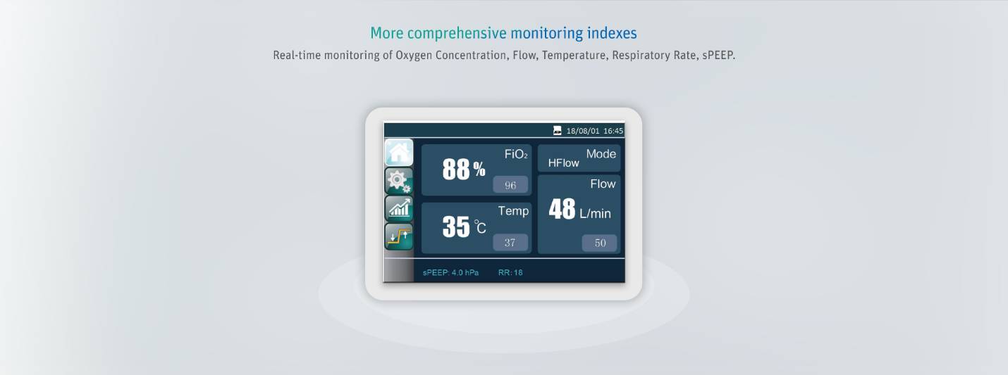 - Real-time oxygen concentration monitoring, flow, temperature monitoring, sPEEP monitoring.